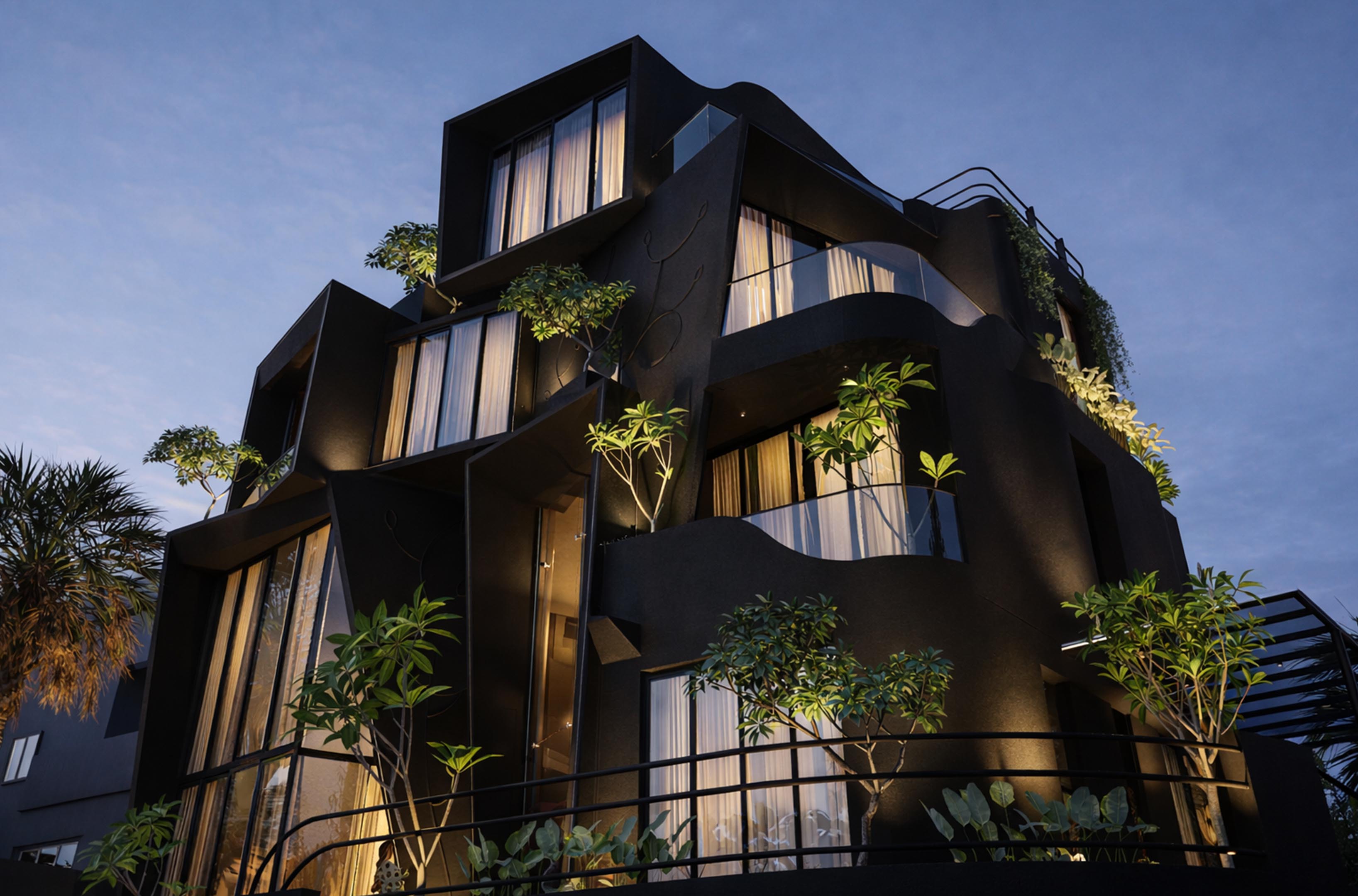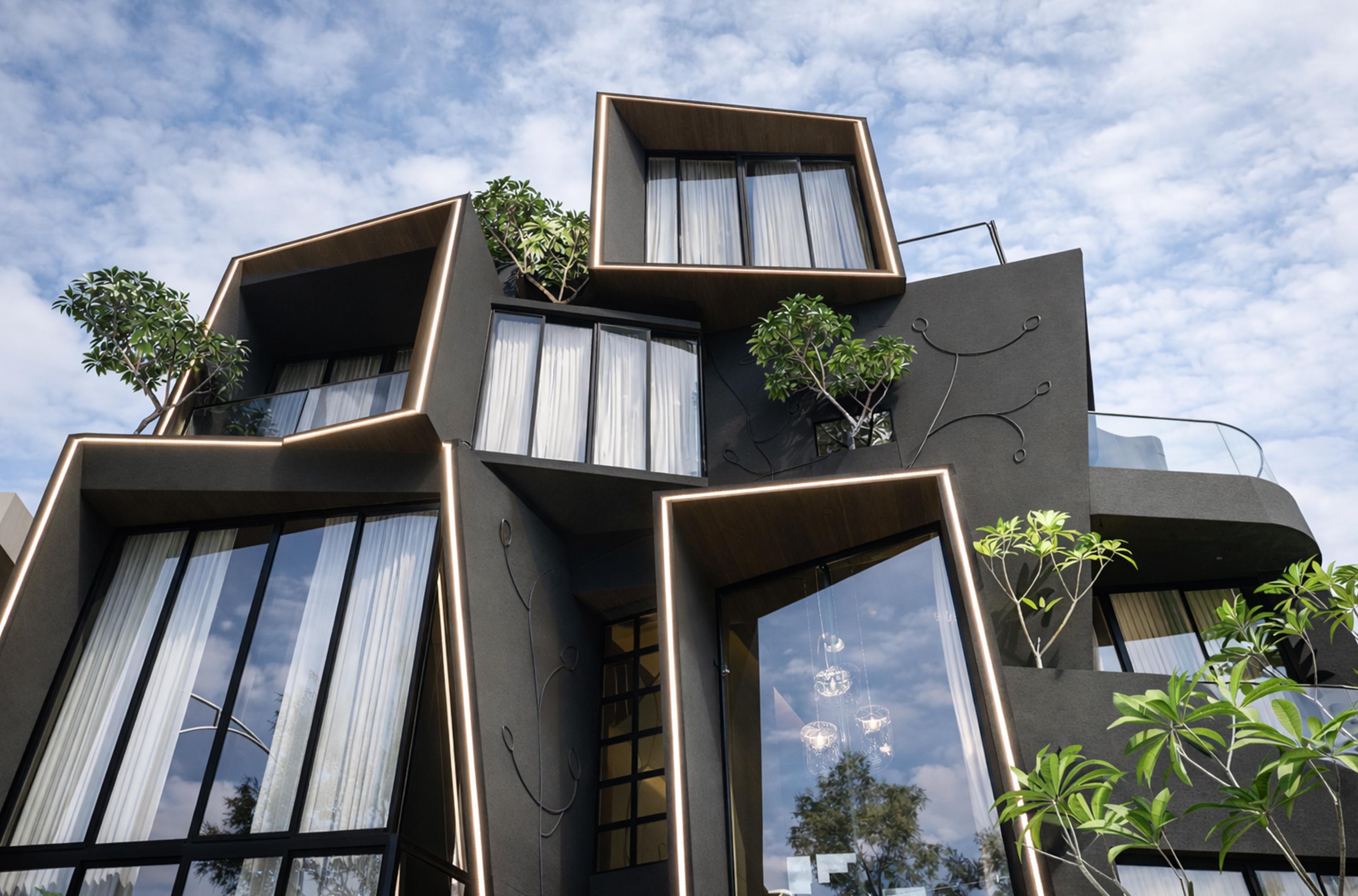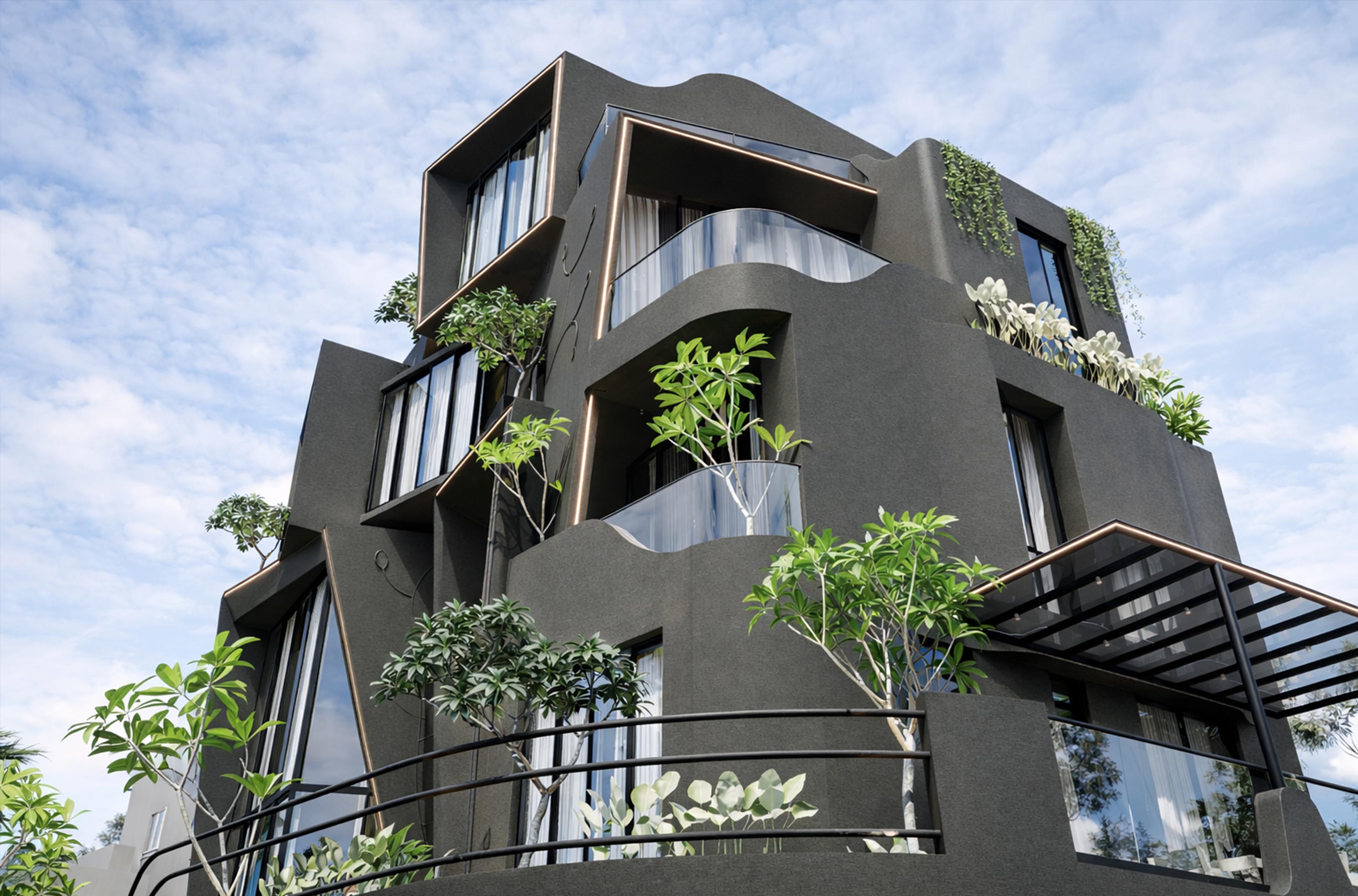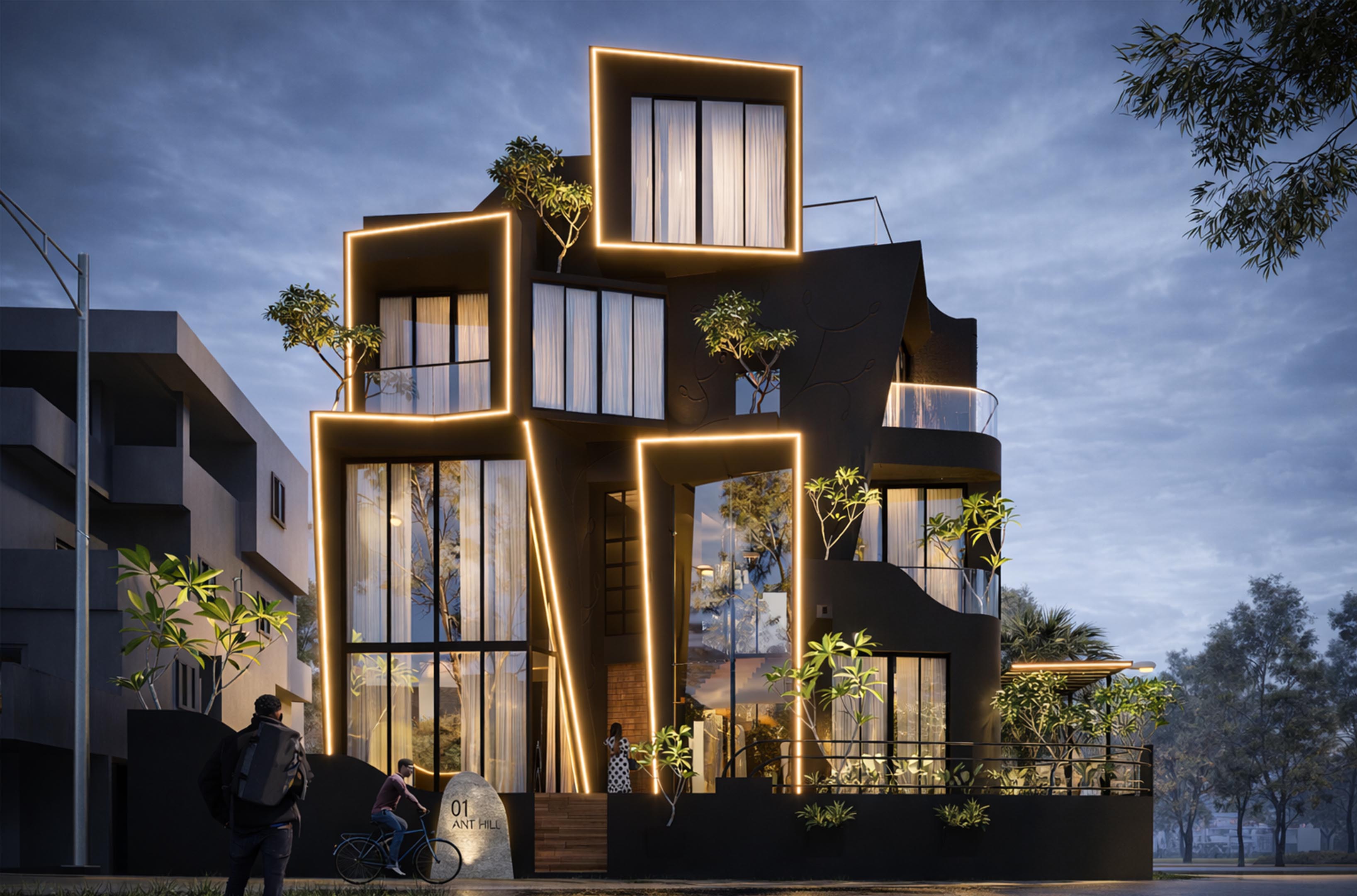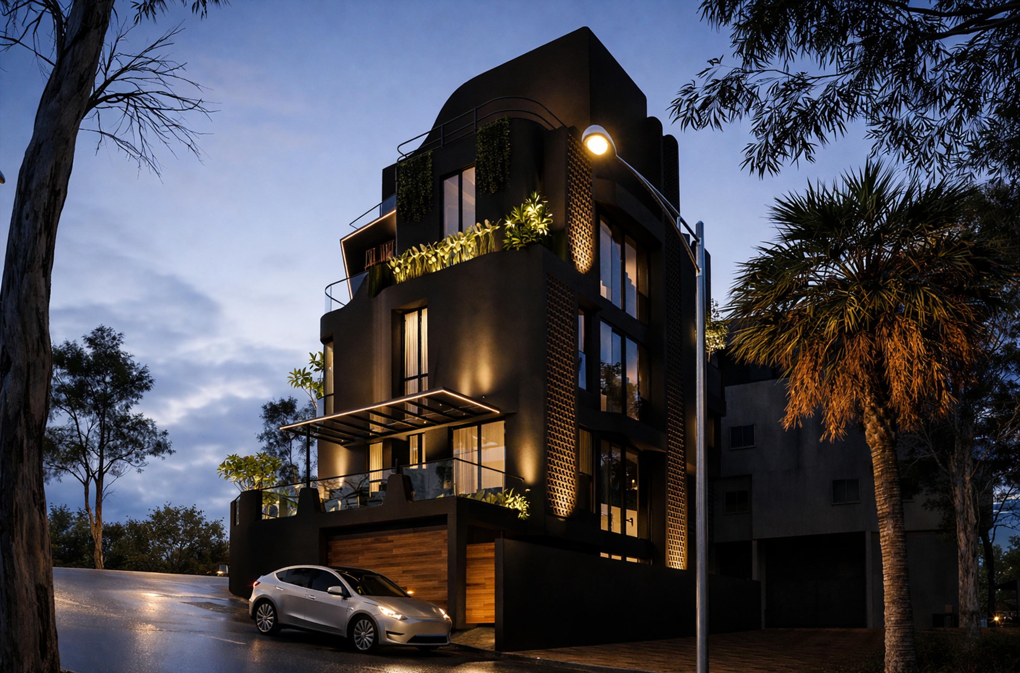 The project is designed as a unique, edgy building with bold architectural and interior elements. Located on a hilly, contoured site, the design responds to the terrain while maximizing views. The client wanted a 180-degree visual connection to the surroundings, leading to the use of angled windows throughout. The focus is on creating a dynamic form that integrates with the landscape and enhances the overall spatial experience.
