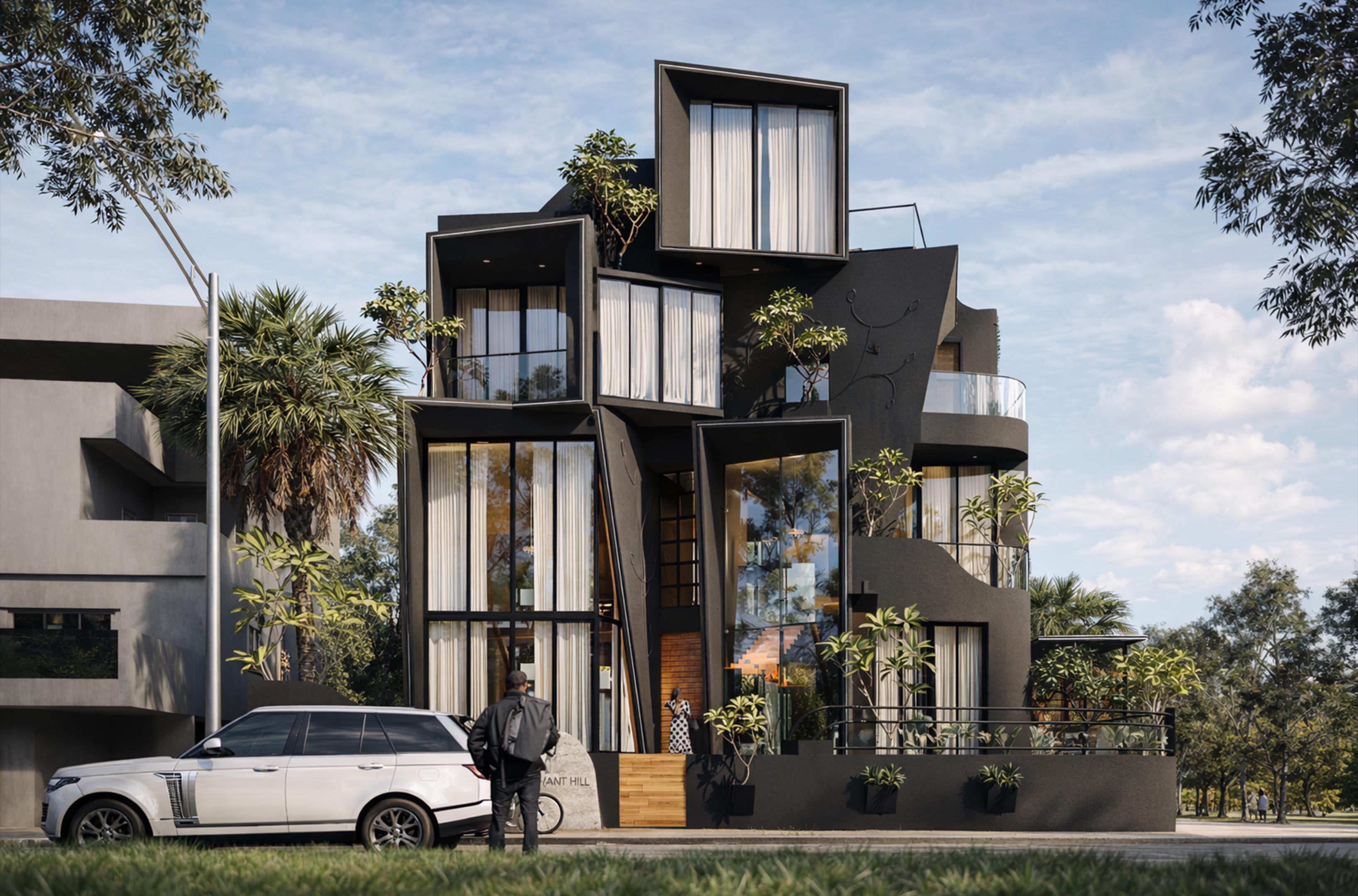 The project is designed as a unique, edgy building with bold architectural and interior elements. Located on a hilly, contoured site, the design responds to the terrain while maximizing views. The client wanted a 180-degree visual connection to the surroundings, leading to the use of angled windows throughout. The focus is on creating a dynamic form that integrates with the landscape and enhances the overall spatial experience.