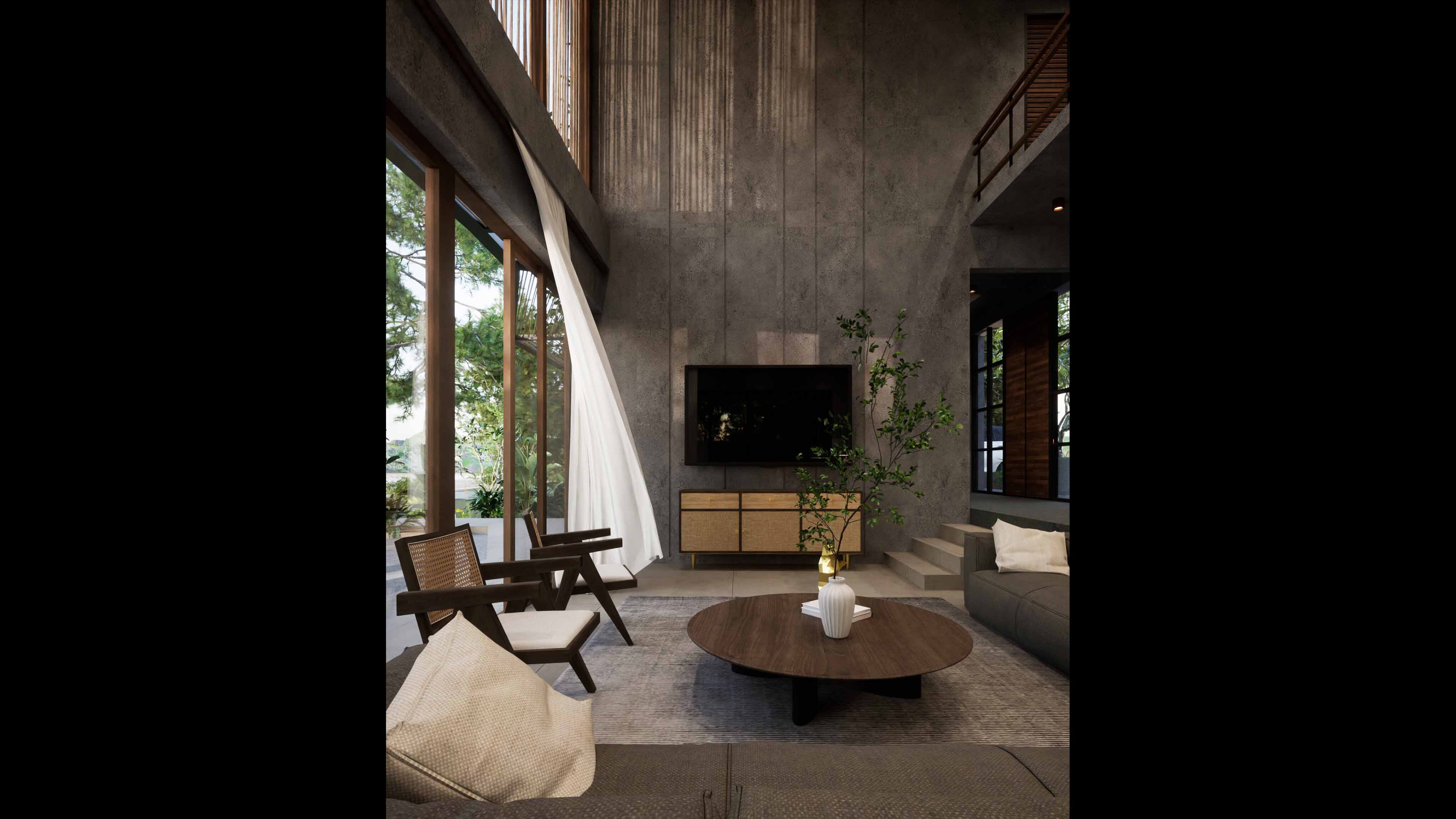 A 3BHK farmhouse in Bhor, with a single ground floor and an exposed concrete structure, designed for holiday getaways and experiencing the serene nature of the area. The home offers open-plan living spaces, large windows for natural light, and seamless indoor-outdoor connectivity.